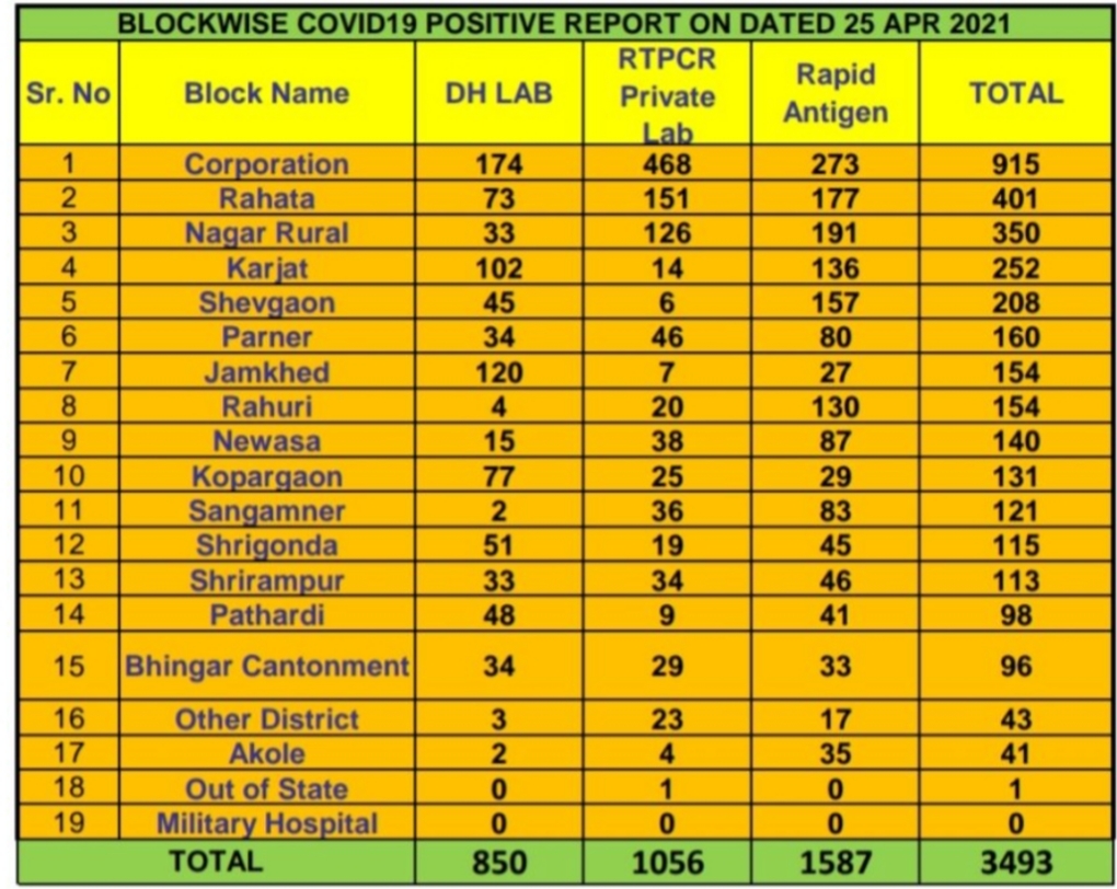 अहमदनगर 915, राहाता 401, संगमनेर 121, पाथर्डी 98, कर्जत 252, कोपरगाव 131 , नगर ग्रामीण 350, श्रीरामपूर 113, अकोले 41, नेवासा 140, पारनेर 160, शेवगाव 208, राहुरी 154, श्रीगोंदा 115, जामखेड 154, भिंगार शहर 96, इतर जिल्हा 43, मिलिटरी हॉस्पिटल 0, इतर राज्य 1, असे रुग्ण आढळून आले आहेत.