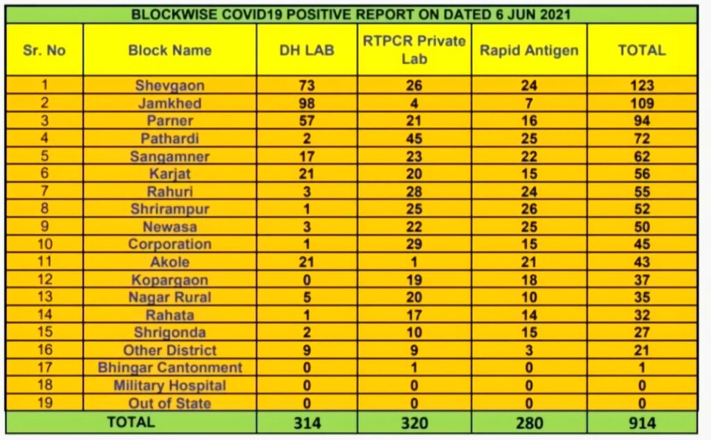 अहमदनगर शहर 45, कर्जत 56, संगमनेर 62, नगर तालुका 35, अकोले 43, राहता 32, पाथर्डी 72, राहुरी 55, शेवगाव 123, कोपरगाव 37, श्रीरामपूर 52, पारनेर 94, नेवासा 50, भिंगार 1,जामखेड 109, श्रीगोंदा 27