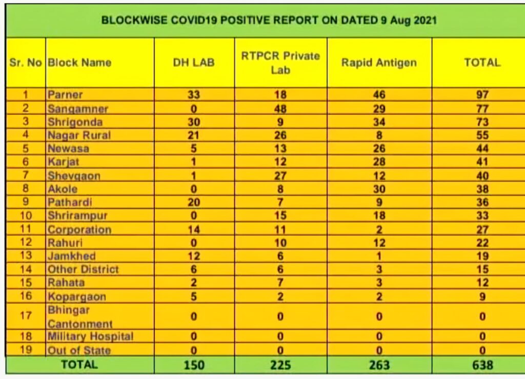 अहमदनगर जिल्ह्यात गेल्या 24 तासात 638 कोरोना रुग्ण आढळले आहे