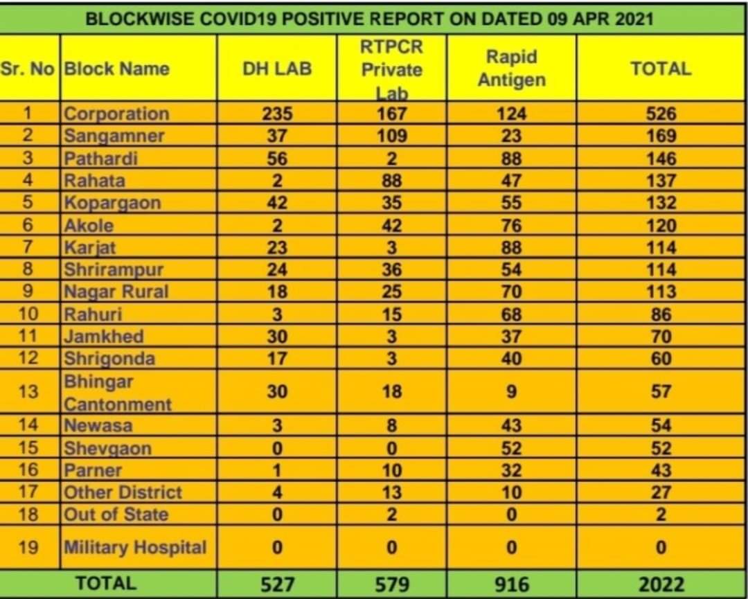 अहमदनगर शहर 526, नगर तालुका 113, कर्जत 114, संगमनेर 169, अकोले 120, राहता 137 , पाथर्डी 146, राहुरी 86, शेवगाव 52, कोपरगाव 132, श्रीरामपूर 114, पारनेर 43, नेवासा 54, भिंगार 57 , जामखेड 70, श्रीगोंदा 60