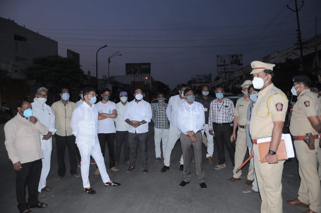कडक लॉकडाऊनच्या पार्श्वभूमीवर शहराचे आमदार संग्राम जगताप महापालिका आयुक्त शंकर गोरे, उपायुक्त यशवंत डांगे, पोलीस उपविभागीय अधिकारी विशाल ढुमे तसेच कोतवाली व तोफखाना पोलीस ठाण्याचे निरीक्षक यांनी मार्केट यार्ड महात्मा फुले चौक येथे पाहणी केली