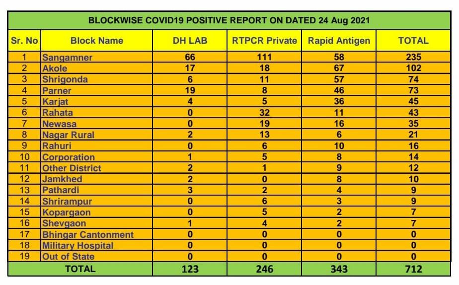 जिल्हा रुग्णालयाच्या कोरोना टेस्ट लॅब मध्ये बाधीत आढळून आलेल्या रुग्णामध्ये मनपा ०१, अकोले १७, जामखेड ०२, कर्जत ०४, नगर ग्रामीण ०२, पारनेर १९, पाथर्डी ०३, संगमनेर ६६, शेवगाव ०१, श्रीगोंदा ०६ आणि इतर जिल्हा ०२ अशा रुग्णांचा समावेश आहे.