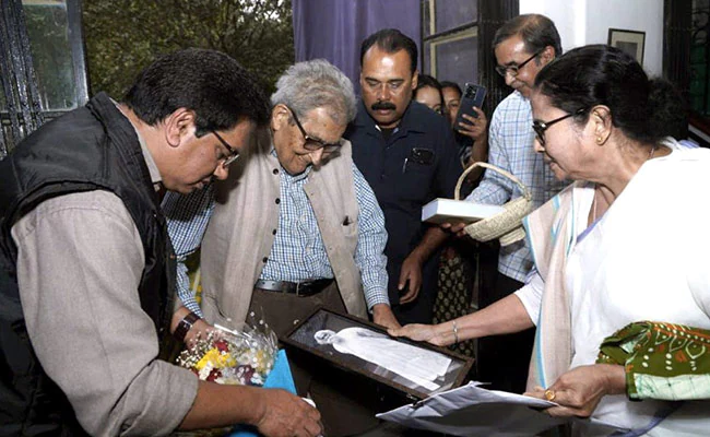 बंगालच्या मुख्यमंत्री ममता बॅनर्जी यांनी नोबेल पारितोषिक विजेते अमर्त्य सेन यांना त्यांच्या शांतिनिकेतन येथील घरी भेट दिली, ज्यासाठी त्यांना विश्व भारती विद्यापीठाकडून अनेक नोटिसा मिळाल्या आहेत आणि त्यांच्या जमिनीची मालकी सिद्ध करणारी कागदपत्रे त्यांना दिली आहेत.