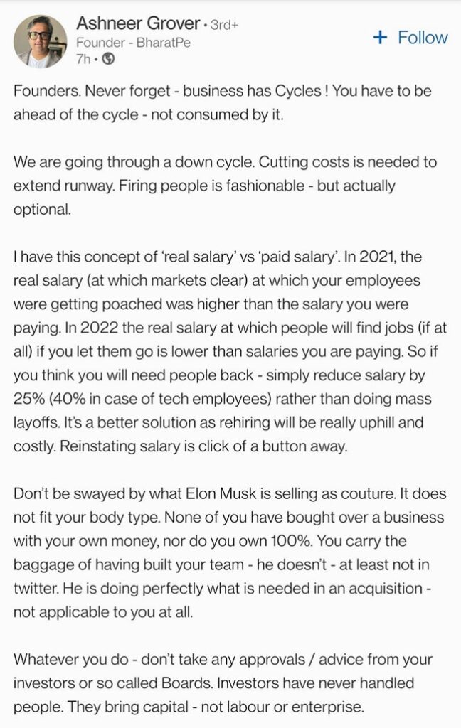 अशनीर ग्रोव्हरने "वास्तविक पगार" आणि "पेड पगार" मधील फरक स्पष्ट केला आणि कर्मचाऱ्यांच्या पगारात कपात करणे हे टाळेबंदीपेक्षा चांगले आहे यावर जोर दिला. “हा एक चांगला उपाय आहे कारण पुनर्भरती खरोखरच चढउतार आणि खर्चिक असेल. पगार पुनर्स्थापित करणे हे एका बटणावर क्लिक करणे आहे,” तो म्हणाला. श्री ग्रोव्हर पुढे म्हणाले की संस्थापकांनी "एलोन मस्क कॉउचर म्हणून विकत असलेल्या गोष्टींमुळे प्रभावित होऊ नये". त्यांनी ठामपणे सांगितले की टेस्लाचे सीईओ ट्विटरवर “परफेक्ट” करत आहेत परंतु त्यांची रणनीती सर्वत्र लागू होत नाही. त्यांनी सुचवले की संस्थापकांनी गुंतवणूकदार किंवा "तथाकथित मंडळे" कडून सल्ला घेऊ नये कारण ते भांडवल आणतात आणि श्रम किंवा उपक्रम नाही.