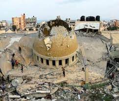 गाझा पट्टी, खान युनिस येथे इस्रायली हवाई हल्ल्यात नष्ट झालेल्या मशिदीबाहेर लोक उभे आहेत. पॅलेस्टिनी प्राधिकरणाने रविवारी परराष्ट्र मंत्री स्तरावर अरब लीगची आपत्कालीन बैठक बोलावण्याचे निवेदन सादर केले. (एपी फोटो)