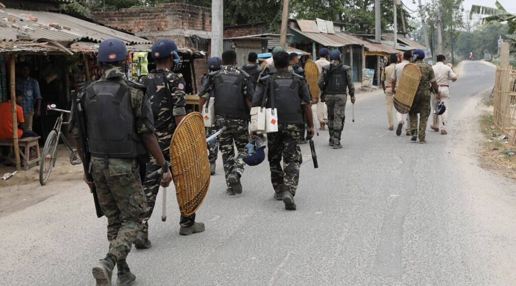 सुरक्षा कर्मचारी गुरुवारी कालियागंजजवळील धनकोइल हाट येथे मार्गक्रमण करत आहेत. (एक्स्प्रेस फोटो पार्थ पॉल)