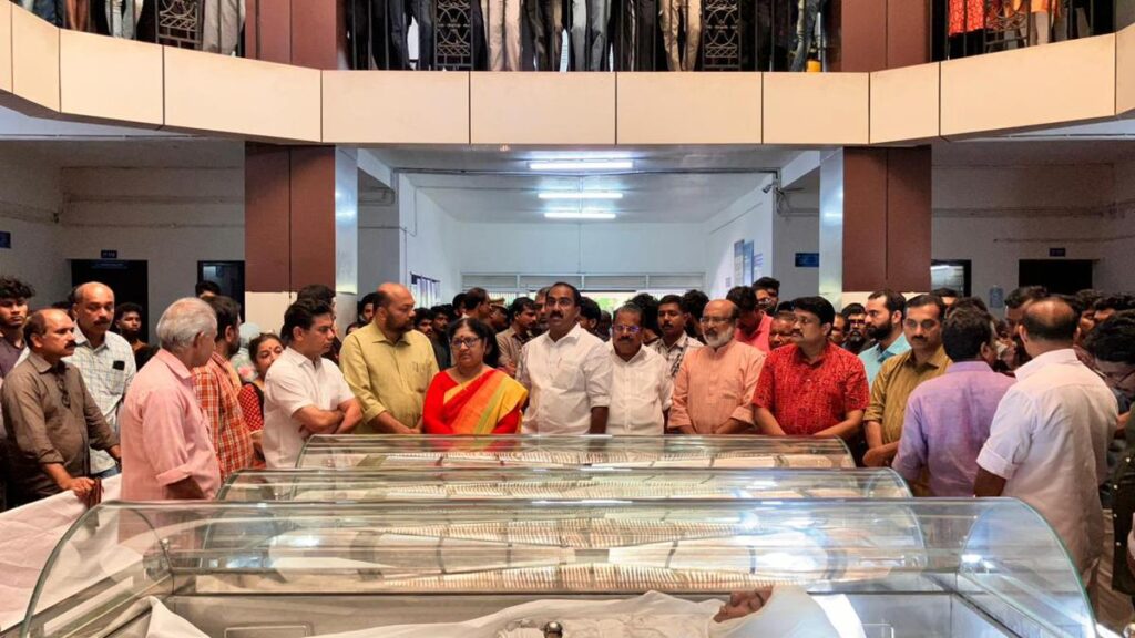 कलामसेरी येथील इंटर युनिव्हर्सिटी टेकफेस्टच्या ठिकाणी शनिवारी झालेल्या चेंगराचेंगरीत मरण पावलेल्या तीन विद्यार्थ्यांचे मृतदेह लोकांच्या श्रद्धांजलीसाठी कुसट कॅम्पस येथील स्कूल ऑफ इंजिनीअरिंग सभागृहात आणण्यात आले आहेत.