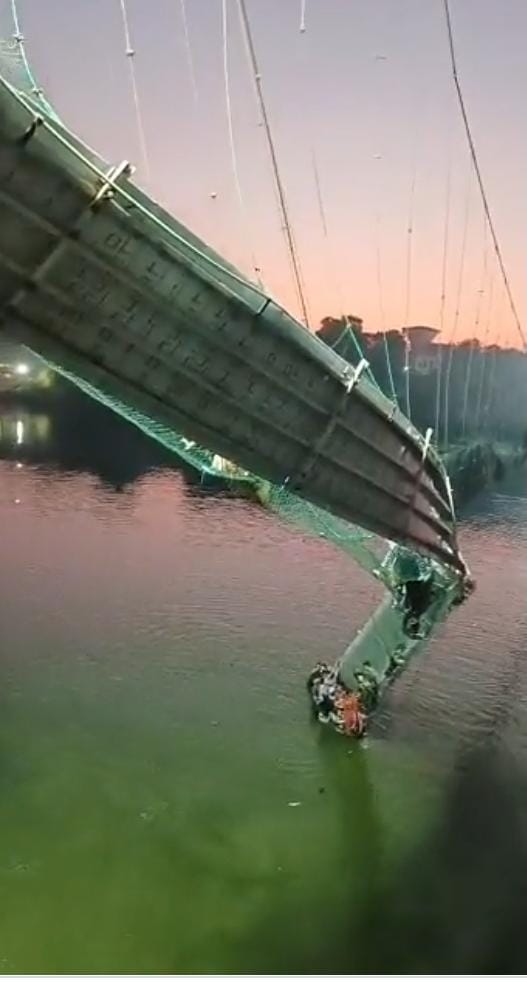 गुजरात में आज शाम को मोरबी में पुल टूटने से बड़ा हादसा हो गया है। घटना के दौरान पुल में करीब 400 लोग मौजूद थे। पुल टूटते ही कई लोग नदी में समा गए। हादसे में 77 लोगों की मौत हो चुकी है। बता दें कि दीपावली पर छुट्टी होने की वजह से काफी संख्या में लोगों की भीड़ मौजूद थी। यहां मच्छु नदी में बना केबल स्टे ब्रिज अचानक टूट जाने से कई लोग नदी में गिर गए। लोगों को नदी से निकालने के लिए रेस्क्यू ऑपरेशन चलाया जा रहा है। जिस समय यह पुल टूटा उस समय घटनास्थल पर भगदड़ मच गई। इस घटना के बाद प्रधानमंत्री दुख जताया है। बता दें कि प्रधानमंत्री नरेंद्र मोदी भी गुजरात दौरे पर हैं। बता दें कि 5 दिन पहले ही इस केबल ब्रिज को रिनोवेशन के बाद चालू किया गया था। रिनोवेशन के बाद भी इतना बड़ा हादसा होने पर अब कई तरह के सवाल खड़े हो रहे हैं। रविवार देर रात मौके पर मौजूद गुजरात के पंचायत मंत्री बृजेश मेरजा के मुताबिक हादसे में करीब 77 लोगों की मौत हो चुकी है और 70 लोग घायल बताए जा रहे हैं। जिन्हें इलाज के लिए अस्पताल में भर्ती कराया गया है। बचे हुए लोगों को नदी से निकालने के लिए रेस्क्यू ऑपरेशन चलाया जा रहा है। हादसे की भयावहता को देखते हुए भारतीय वायु सेना (IAF) के गरुड़ कमांडो की टीम को रवाना कर दिया गया है। बताया जा रहा है कि मृतकों की संख्या अभी और बढ़ सकती है। मच्छू नदी पर नवनिर्मित केबल पुल तीन दिन पहले खोला गया था। ये हादसा शाम 7 बजे हुआ है, उस वक्त पुल पर 500 लोग मौजूद थे। ये सभी छठ (Chhath) का त्योहार मना रहे थे। इस हादसे पर गुजरात के सीएम भूपेंद्र पटेल ने ट्वीट करके दुख जताया है। उन्होंने लिखा कि, “मोरबी में केबल पुल गिरने के हादसे से मुझे गहरा दुख हुआ है। प्रशासन की ओर से राहत और बचाव कार्य जारी है। प्रशासन को घायलों के तत्काल इलाज की व्यवस्था करने का निर्देश दिया गया है। मैं इस संबंध में जिला प्रशासन से लगातार संपर्क में हूं। प्रधानमंत्री नरेंद्र मोदी ने हादसे में जान गंवाने वालों में से प्रत्येक के परिजनों के लिए पीएमएनआरएफ (PMNRF) से 2 लाख रुपये और घायलों के लिए 50 हजार रुपये अनुग्रह राशि की घोषणा की है। गुजरात के सीएम भूपेंद्र पटेल ने भी राज्य सरकार की ओर से प्रत्येक मृतक के परिवार को 4 लाख रुपये और घायलों को 50,000 रुपये देने का एलान किया है।मोरबी का यह सस्पेंशन ब्रिज 140 साल से भी ज्यादा पुराना है और इसकी लंबाई करीब 765 फीट है। यह सस्पेंशन ब्रिज गुजरात के मोरबी ही नहीं बल्कि पूरे देश के लिए ऐतिहासिक धरोहर है। इस ब्रिज का उद्घाटन 20 फरवरी 1879 को मुंबई के गवर्नर रिचर्ड टेम्पल ने किया था। यह उस समय लगभग 3.5 लाख की लागत से 1880 में बनकर तैयार हुआ था। उस समय इस पुल को बनाने का पूरा सामान इंग्लैंड से ही मंगाया गया था। इसके बाद इस पुल का कई बार रेनोवेशन किया 