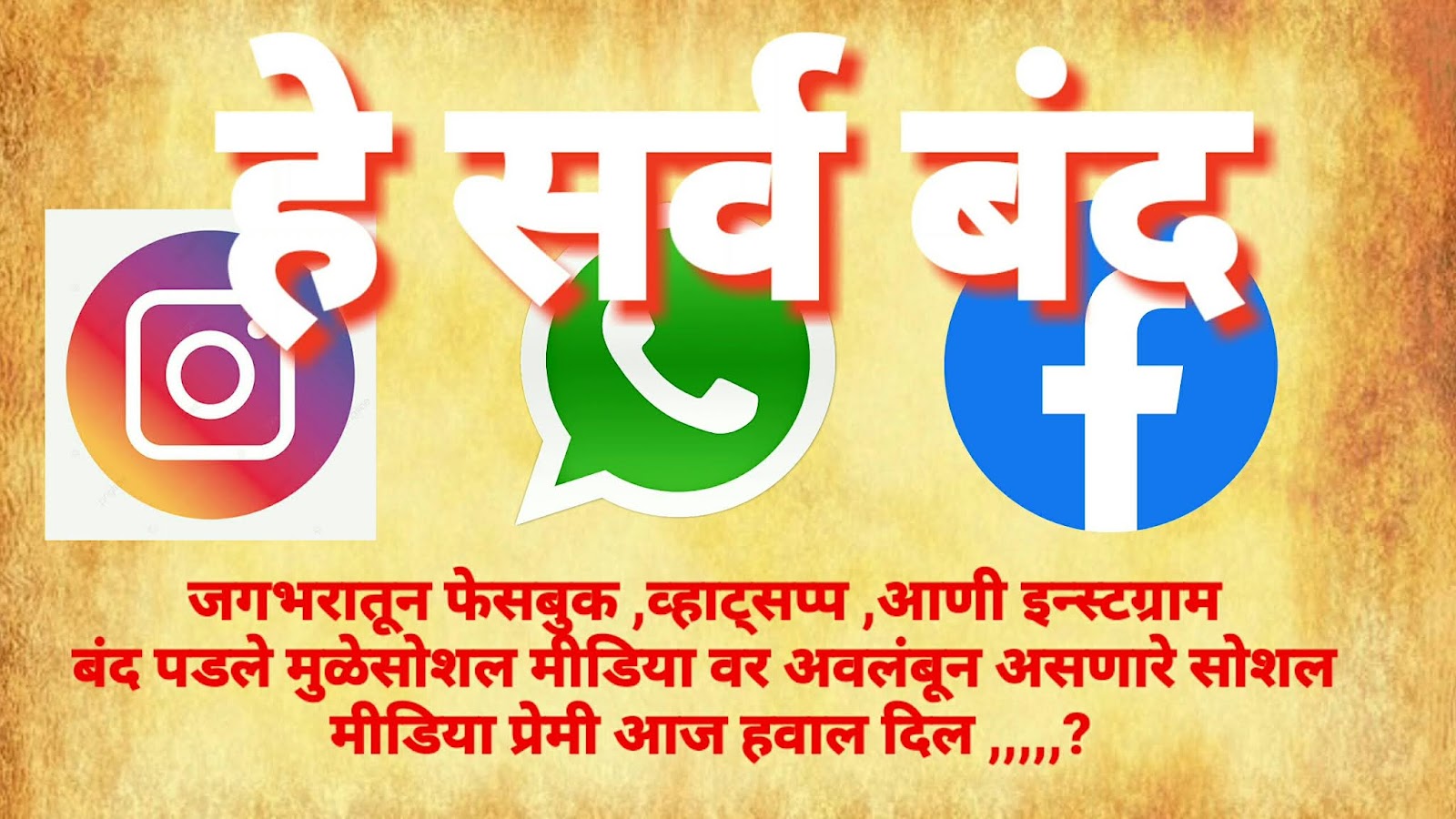 आणी इन्स्टग्राम बंद पडले .सोशल मीडिया वर अवलंबून असणारे सोशल मीडिया प्रेमी हवाल दिल झाले होते, या बाबतीत अनेक तर्कवितर्क सुरू आहेत या मुळे काल रात्री काही जण निवांतपणे झोपले तर काही जणांची झोप उडाली होती,पाहुयात आता हे कधी व्यवस्थित चालू होते आहे ते.