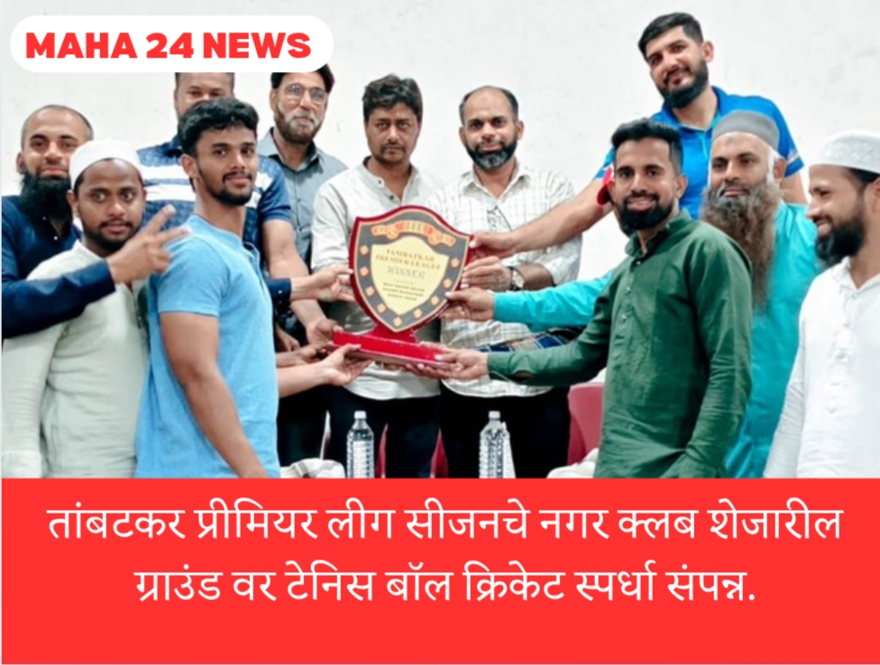 नगर (प्रतिनिधी)- शहरातील नगर क्लब येथील ग्राउंड येथे माजी नगरसेवक शेख मुदस्सर अहमद इसहाक यांनी आयोजित केलेल्या तांबटकर प्रीमियर लीग सीजन 8 चे आयोजन केले होते या टूर्नामेंटमध्ये अनेक संघांनी सहभाग नोंदविला होता या स्पर्धेतील खेळाडूंनी आपली उत्तम कामगिरी दाखवून आपल्या संघास विजयी केले व अंतिम सामना महाराष्ट्र इलेव्हन विरुद्ध इंदोर वाला या संघामध्ये सामना रंगला होता मात्र इंदोर वाला संघाचे नऊ गडी बाद होऊन महाराष्ट्र इलेव्हन या संघाने आपला विजय मिळून त्या संघास ट्रॉफी प्रशस्तीपत्र देताना माजी नगरसेवक शेख मुदस्सर अहमद इसहाक समवेत नागोरी मुस्लिम जमात ट्रस्टचे इस्तेखार खान, अमन शेख शेरू सर जावेद शेख आलम खान फरान खान नवीद खान रियान खान, उमरखान सुफियान खान जवाद खान, मुजम्मिल खान जहीर खान साजिद भैय्या मोहसीन काजी समीर शेख आदीसह खेळाडू मोठ्या संख्येने उपस्थित होते. यावेळी माजी नगरसेवक शेख मुदस्सर अहमद इसहाक म्हणाले की, खेळाडूंना चालना देण्यासाठी दरवर्षी क्रिकेट स्पर्धेचे आयोजन करण्यात येते. व मोबाईलच्या आहारी गेलेल्या युवकांना मैदानी खेळातून बाहेर पडता येणार आहे. खेळातून मन व शरीर सदृढ बनते. पराभवाने खचून न जाता पुन्हा जिद्दीने पुढे जाण्याचे व विजयाने हुरळून न जाता पुढे वाटचाल करण्याचे खेळाडूवृत्ती मैदानी खेळातून विकसीत होत असते. यासाठी पालकांनी मुलांना मैदानाकडे घेऊन येण्याची गरज असल्याचे त्यांनी सांगितले.