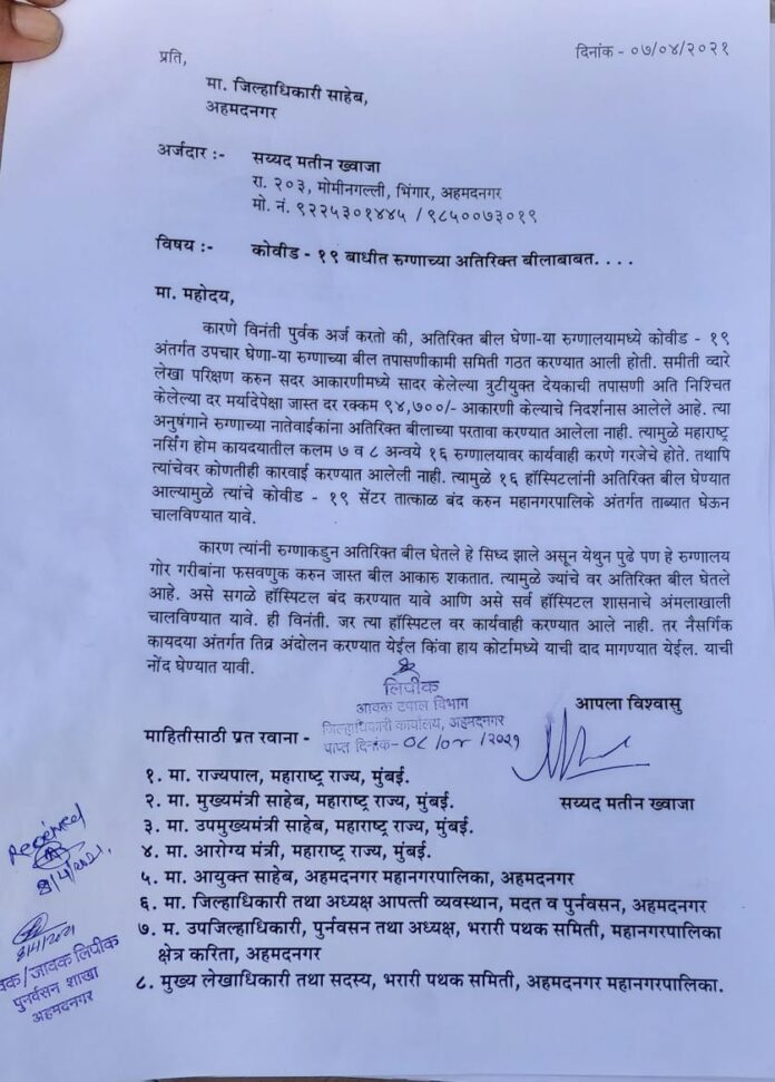 जिल्हा प्रशासनाला दिलेल्या निवेदनात सय्यद यांनी म्हटलं आहे, की अहमदनगर शहर आणि परिसरातल्या १६ नामांकित खासगी रुग्णालयांमध्ये कोविड सेंटर्स सुरु करण्यात आली होती. मात्र या खासगी रुग्णालयांमध्ये कोरोना व्हायरसच्या कोविड रुग्णांवर उपचार करतांना या कोविड सेंटर्सच्या चालकांनी अर्थात खासगी डाॅक्टरांनी राज्यशासनाच्या नियमांची पायनल्ली करत प्रत्येक रुग्णांच्या नातेवाईकांकडून अव्वाच्या सव्वा बिले आकारली होती. आकारण्यात आलेल्या या अतिरिक्त बिलांच्या तपासणीसाठी एक समिती गठित करण्यात आली होती. या समितीने जिल्हा प्रशासनाला एक असा अहवाल दिला होता, की या १६ कोविड सेंटर्सच्या चालकांनी कोविड रुग्णांच्या प्रत्येक नातेवाईकांकडून तब्बल 1 कोटी 12 लाख 66 हजार 192 रुपयांची रक्कम अतिरिक्त बिलांच्या मार्फत आकारली आहेत. या अहवालानंतर बोटांवर मोजता येणार्या काही खासगी रुग्णालयांनी अतिरिक्त बिलांची रक्कम अहमदनगर महानगरपालिकेत जमा केल्याचे सांगण्यात आले आहे.