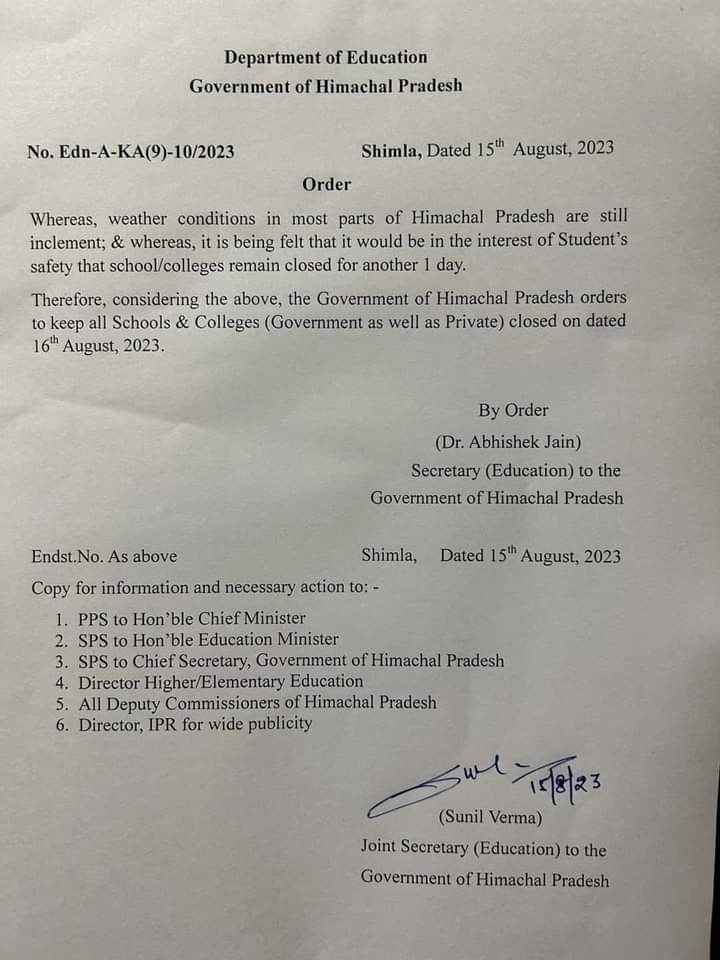 हिमाचल प्रदेश सरकारने राज्यातील संततधार पावसाच्या पार्श्वभूमीवर 16 ऑगस्ट रोजी सर्व शाळा आणि महाविद्यालये बंद ठेवण्याचे आदेश दिले आहेत. बुधवारी सर्व शाळा आणि महाविद्यालये, सरकारी तसेच खासगी बंद राहतील, असे आदेशात म्हटले आहे.