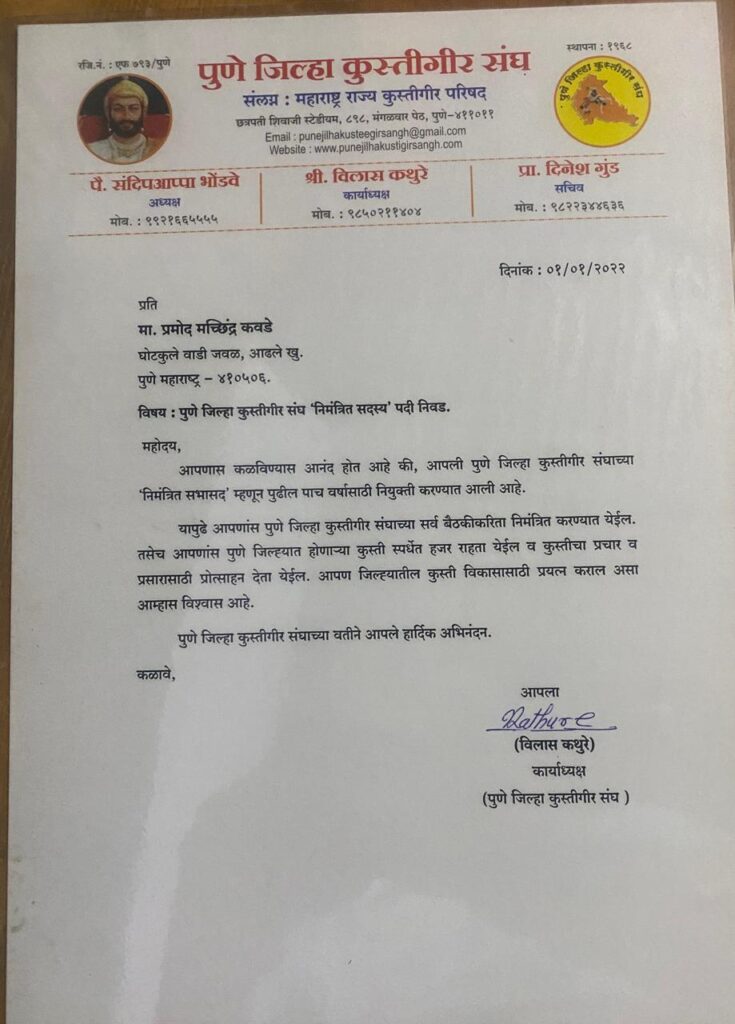 - पुणे येथील मामा साहेब मोहोळ कुस्ती संकुल येथे महाराष्ट्र राज्य कुस्तिगीर परिषद व पुणे जिल्हा कुस्तीगीर परिषद संघाच्या सदस्य पदी निवड झाल्याबद्दल सर्व वस्ताद पद आधिकारी,मा.पोलीस सह आयुक्त पुणे शहर बोरकर साहेब वस्ताद ज्ञानेश्वर मांगडे भावी आमदार कुलदीप तात्या कोंडे महान भारत केसरी पै.विजय हनुमंत गावडे याच्या हास्ते सत्कार देण्यात आला व पुढील वाटचालीसाठी शुभेच्छा दिल्या.