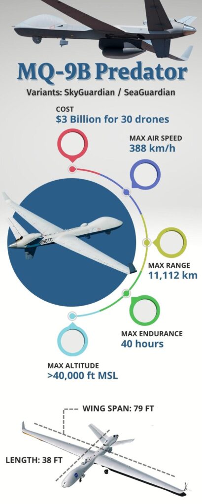 MQ-9B, जे भारतीय सशस्त्र दलांच्या गुप्तचर, पाळत ठेवणे आणि शोध (ISR) क्षमतांमध्ये लक्षणीय वाढ करेल आणि यूएस-मूळच्या P-8I लांब पल्ल्याच्या सागरी गस्ती विमानांसोबत काम करेल आणि भारतीय नौदलाच्या पाळत ठेवण्यामध्ये लक्षणीय वाढ करेल. हिंदी महासागर प्रदेश.