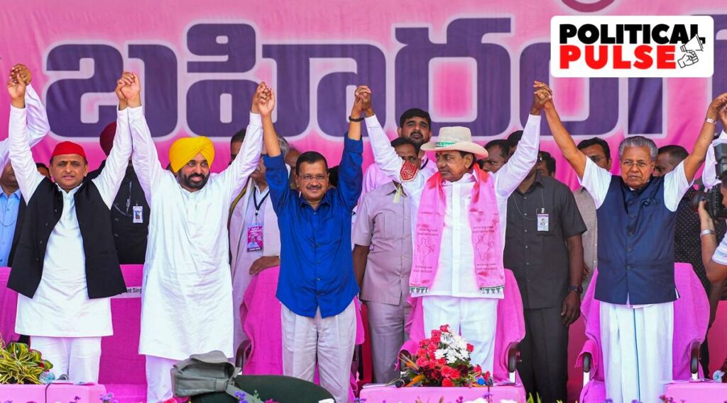 बुधवारी येथे भारत राष्ट्र समिती (BRS) मेळाव्याच्या मंचावर देशातील काही प्रमुख विरोधी पक्षांचे नेते एकत्र आले असताना, त्यातील आयात आणि महत्त्व बहुतेक श्रोत्यांमध्ये हरवलेले दिसत होते.