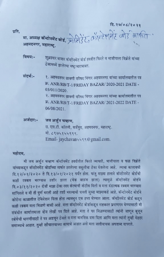 - भिंगार येथील शुक्रवार बाजार कॅन्टोन्मेंट बोर्ड हद्दीत फिरते व भाजीपाला विक्रेते यांच्या ठेकयामध्ये भ्रष्टाचार झाल्याचा आरोप. कॅन्टोन्मेंट बोर्डाचे सिओ विद्याधर पवार व शिरीष पाटसकर यांनी रोख रक्कम घेऊन पत्र दिल्याचा आरोप – जय अर्जुन चव्हाण.