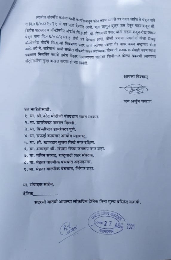 - अहमदनगर (प्रतिनिधी)- कॅन्टोन्मेंट हद्दीतील फिरते व्यापारी भाजीपाला व फळ विक्रेते यांच्याकडून कॅंटोन्मेंट बोर्डाच्या मार्फत ठरलेल्या वसुलीचा ठेका जय अर्जुन चव्हाण यांनी घेतलेला आहे. त्याचा कालावधी 12 जानेवारी 2020 ते 13 जानेवारी 2021 पर्यंत होता परंतु चव्हाण यांच्या हाताने कॅन्टोन्मेंट बोर्डाची काही रक्कम भरण्यास उशीर झाला चेक बाउन्स झाला त्यामुळे कॅन्टोन्मेंट बोडणे 3 नोव्हेंबर 2020 रोजी ठेका रद्द केल्याची नोटीस दिली व मला दंडात्मक रक्कम भरण्यास सांगितले व मी ती पूर्ण भरली आहे तशी भरल्याची पावती सुद्धा माझ्याकडे आहेत कॅंटोन्मेंट बोर्डाने कोरूना काळातील रेमिनेशन दिला होता त्यामधून एक हप्ता घेण्यात आला कॅन्टोन्मेंट बोर्ड कडून काही रक्कम मला मिळणे बाकी आहे मला कॅंटोनमेंट बोर्डाकडून ना हरकत प्रमाणपत्र घेण्यासाठी मी संबंधित कार्यालयाला दोन लेखी पत्र दिले आहे मला ते पत्र मिळण्यासाठी त्यांनी जाणून-बुजून रक्कमेची मागणी साठी ते पत्र काढून ठेवले व मला मानसिक त्रास दिला आणि मला त्यांनी तुम्ही मेहतर समाजाचे आहात तुम्ही शौचालयाच्या कामाची आहात असे मला जातिवाचक अपशब्द वापरले व त्यानंतर संदर्भात कर्मचाऱ्यांनी कार्यालयातून फोन करून आपले पत्र तयार आहेत ते घेऊन जावे व 6 ऑगस्ट 2021 चे पत्र मला देण्यात आले मला जाणून बुजून त्रास देऊन माझ्याकडून शिरीष पाटसकर व कॅन्टोन्मेंट बोर्डाचे सीओ विद्याधर पवार यांनी माझ्याकडून रोख रक्कम घेऊन 6 ऑगस्ट 2019 रोजी पत्र देण्यात आले दोन्ही पत्राचा अवलोकन केला असता कॅन्टोन्मेंट बोर्डाचे सचिव विद्याधर पवार यांनी त्यांच्या पदाचा गैरवापर करून भ्रष्टाचार केला आहे तरी याची सखोल चौकशी करून त्यांच्यावर योग्य ती कडक कारवाई करून त्यांना पदावरून निलंबित करावे तसेच मेहतर समाजाच्या जातीवर शिवीगाळ केल्याप्रकरणी त्यांच्यावर ॲट्रॉसिटीचा गुन्हा दाखल करण्याची मागणी निवेदनाद्वारे डायरेक्टर जनरल दिल्ली व प्रिन्सिपल डायरेक्टर पुणे आदीसह संबंधित विभागाला निवेदन देण्यात आले.