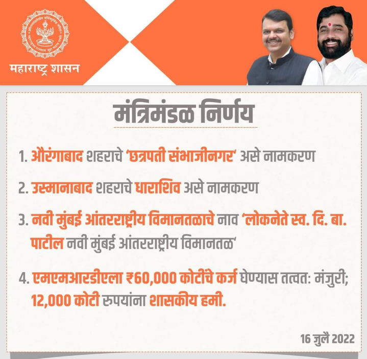 मंत्रिमंडळ निर्णय1. औरंगाबाद शहराचे ‘छत्रपती संभाजीनगर‘ असे नामकरण2. उस्मानाबाद शहराचे धाराशिव असे नामकरण3. नवी मुंबई आंतरराष्ट्रीय विमानतळाचे नाव ‘लोकनेते स्व. दि. बा. पाटील नवी मुंबई आंतरराष्ट्रीय विमानतळ‘4. एमएमआरडीएला ₹60,000 कोटींचे कर्ज घेण्यास तत्वतः मंजुरी;12,000 कोटी रुपयांना शासकीय हमी.