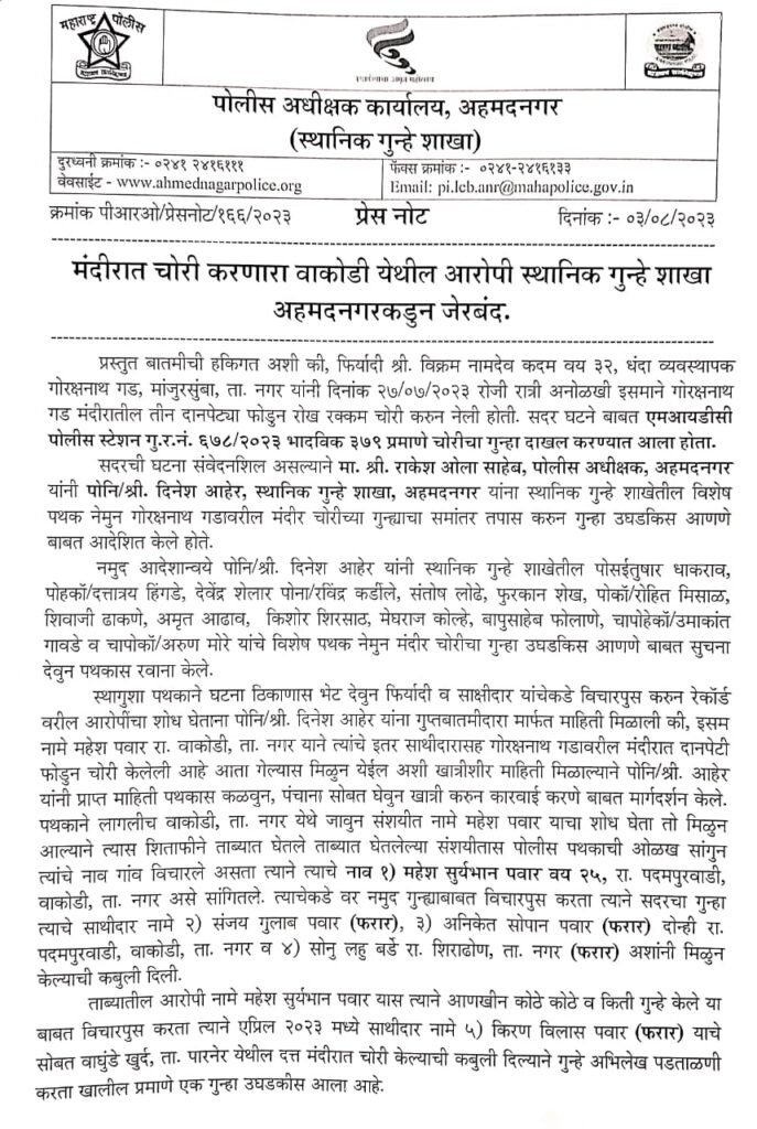 ताब्यातील आरोपी नामे महेश सुर्यभान पवार यास त्याने आणखीन कोठे कोठे व किती गुन्हे केले या बाबत विचारपुस करता त्याने एप्रिल 2023 मध्ये साथीदार नामे 5) किरण विलास पवार (फरार) याचे सोबत वाघुंडे खुर्द, ता. पारनेर येथील दत्त मंदीरात चोरी केल्याची कबुली दिल्याने गुन्हे अभिलेख पडताळणी करता खालील प्रमाणे एक गुन्हा उघडकीस आला आहे.