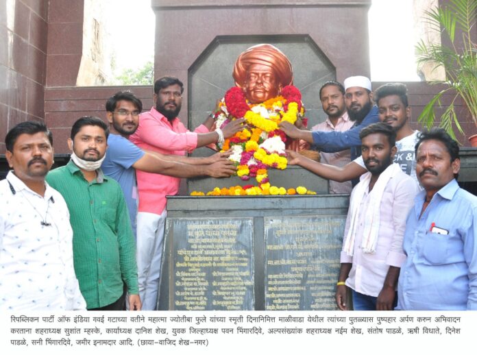 रिपब्लिकन पार्टी ऑफ इंडिया गवई गटाच्या वतीने महात्मा ज्योतीबा फुले यांच्या स्मृती दिनानिमित्त माळीवाडा येथील त्यांच्या पुतळ्यास पुष्पहार अर्पण करुन अभिवादन करण्यात आले. यावेळी शहराध्यक्ष म्हस्के बोलत होते. याप्रसंगी आरपीआयचे कार्याध्यक्ष दानिश शेख, युवक जिल्हाध्यक्ष पवन भिंगारदिवे, अल्पसंख्यांक शहराध्यक्ष नईम शेख, संतोष पाडळे, ऋषी विधाते, दिनेश पाडळे, सनी भिंगारदिवे, जमीर इनामदार आदि उपस्थित होते. उपस्थितांनी महात्मा फुलेंचा जयघोष करुन त्यांना अभिवादन केले.