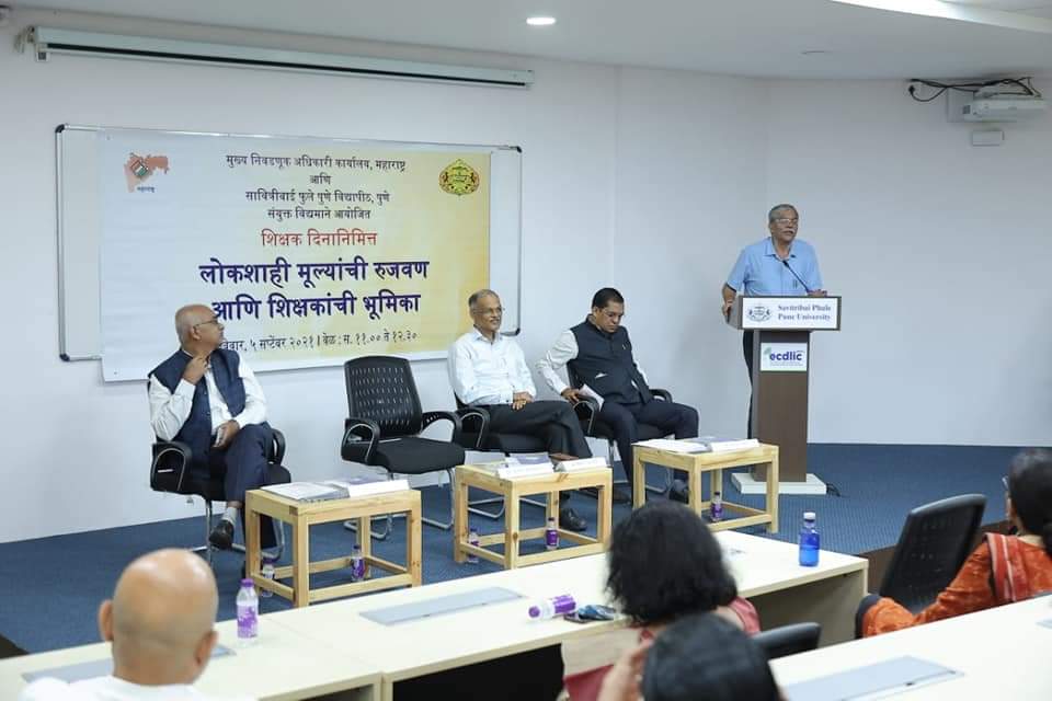 मुख्य निवडणूक अधिकारी कार्यालय आणि सावित्रीबाई फुले पुणे विद्यापीठ यांच्या संयुक्त विद्यमाने ‘लोकशाही मूल्यांची रुजवण आणि शिक्षकांची भूमिका’ या कार्यक्रमाचे आयोजन विद्यापीठात केले होते. त्यावेळी श्रीकांत देशपांडे बोलत होते. राष्ट्रीय शिक्षक दिनाचे औचित्य साधून हा कार्यक्रम घेण्यात आला. यावेळी सावित्रीबाई फुले पुणे विद्यापीठाचे कुलगुरू प्रा.डॉ. नितीन करमळकर, उच्च शिक्षण विभागाचे संचालक डॉ. धनराज माने, विद्यापीठाचे प्र- कुलगुरू डॉ. एन.एस.उमराणी, उपजिल्हा निवडणूक अधिकारी मृणालिनी सावंत, डॉ. दीपक पवार आदी यावेळी उपस्थित होते. यावेळी शिक्षक दिनानिमित्त डॉ. श्रुती तांबे, डॉ. राजेश्वरी देशपांडे आणि डॉ. सुहास पळशीकर या प्राध्यापकांचा सत्कार करण्यात आला.