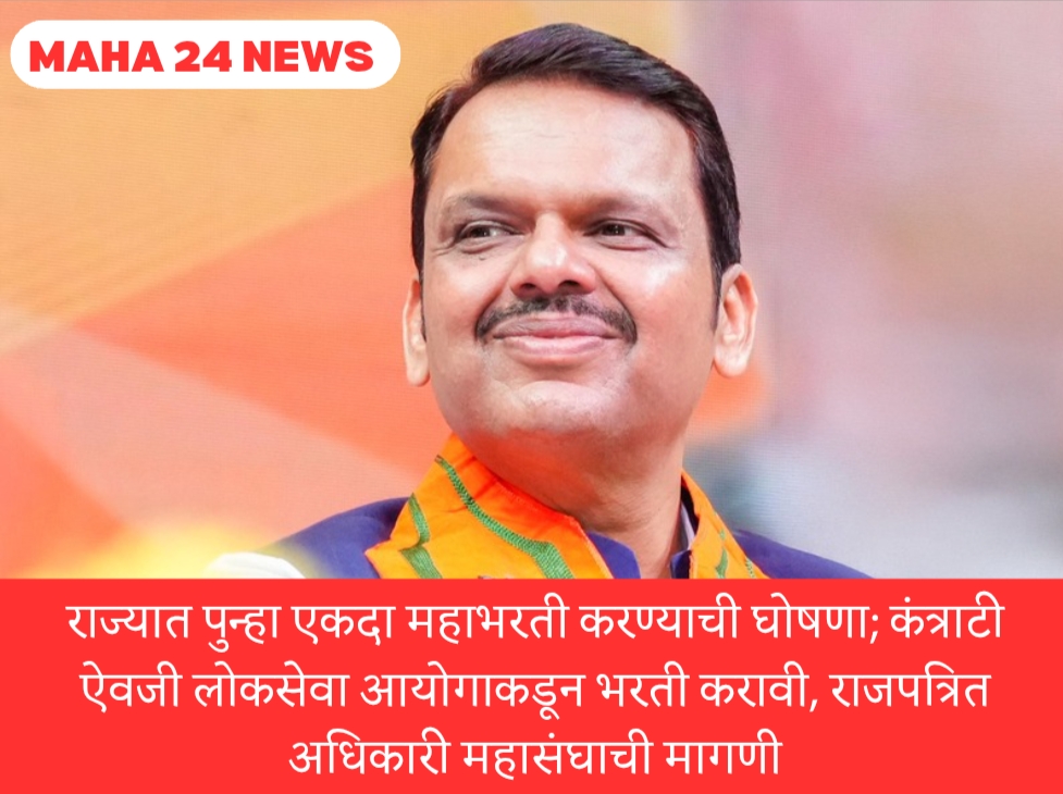 राज्यात पुन्हा एकदा महाभरती सुरू करण्याची घोषणा मुख्यमंत्र्यांनी दोनच दिवसांपूर्वी विधानसभेत केली होती. राज्यभरातील अधिकाऱ्यांचे नेतृत्व करणाऱ्या राजपत्रित अधिकारी महासंघाने सरकारच्या महाभरती बाबतच्या घोषणेचे स्वागत करताना शासनाच्या सेवेतील रिक्त पदे कंत्राटी पध्दतीऐवजी वैधानिक मार्गाने समयमर्यादेत भरण्याची मागणी केली आहे. महासंघाचे अध्यक्ष विनोद देसाई आणि सरचिटणीस