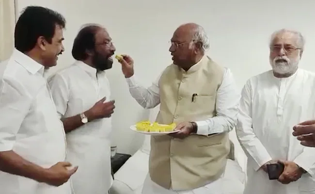 काँग्रेसचे प्रदेशाध्यक्ष मल्लिकार्जुन खर्गे यांनी मिठाई देऊन आनंद साजरा केला.