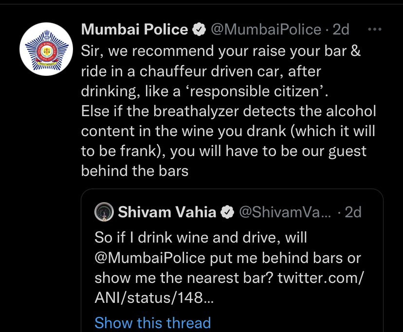 जर ब्रेथ अॅनालयाझरमध्ये तुम्ही सेवन केलेल्या वाईनमध्ये अल्कोहोलचा अंश आढळला तर तुम्हाला तुरुंगात आमचा पाहुणा म्हणून यावे लागेल,” असं उत्तर मुंबई पोलिसांनी दिलं आहे.