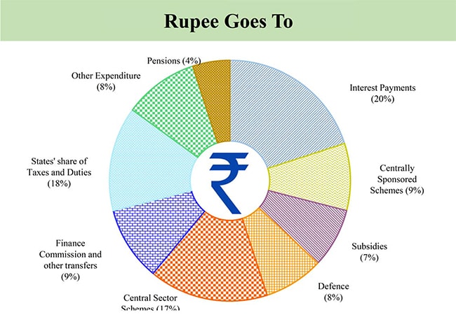 दुसऱ्या शब्दांत: सरकार खर्च करत असलेल्या प्रत्येक रुपयासाठी 20 पैसे कर्ज आणि दायित्वांच्या परतफेडीमध्ये जातात.