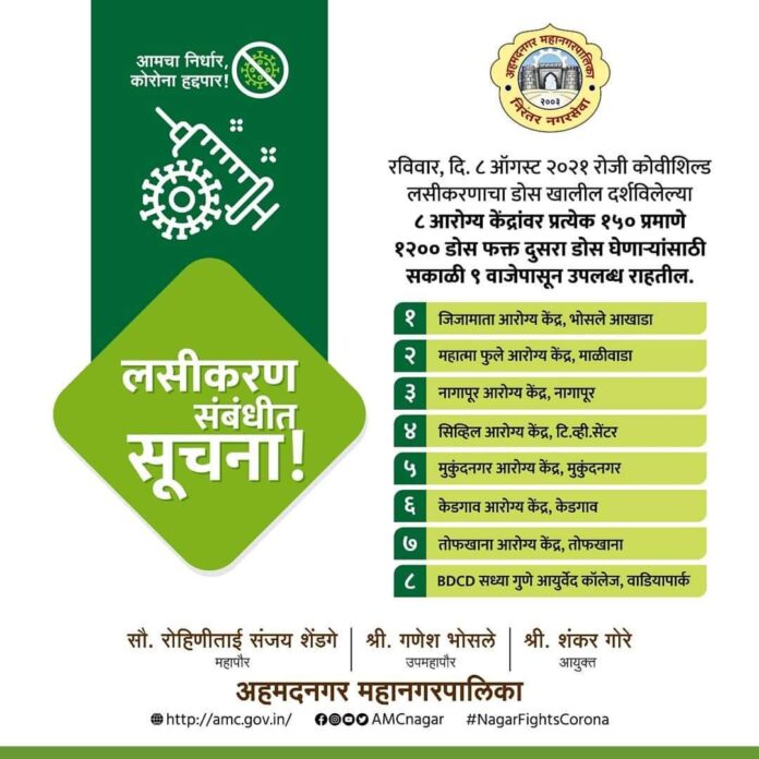 रविवार, दि. ८ ऑगस्ट २०२१ रोजी कोवीशिल्ड लसीकरणाचा डोस खालील दर्शविलेल्या ८ आरोग्य केंद्रांवर प्रत्येक १५० प्रमाणे १२०० डोस फक्त दुसरा डोस घेणाऱ्यांसाठी सकाळी ९ वाजेपासून उपलब्ध राहतील.