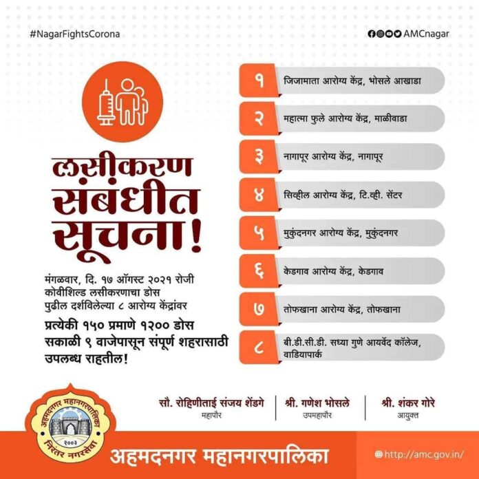 मंगळवार, दि. १७ ऑगस्ट २०२१ रोजी कोवीशिल्ड लसीकरणाचा डोस पुढील दर्शविलेल्या ८ आरोग्य केंद्रांवर