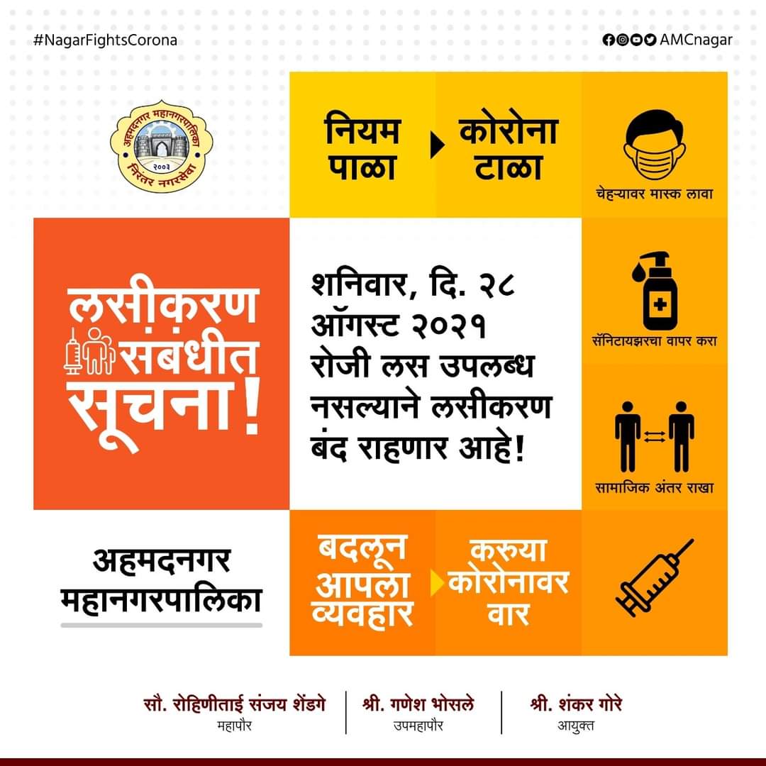 शनिवार, दि. २८ ऑगस्ट २०२१ रोजी लस उपलब्ध नसल्याने लसीकरण बंद राहणार आहे!