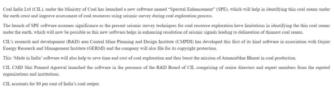 Coal India Limited under the Ministry of Coal has launched a new software named Spectral Enhancement SPE which will help in identifying thin coal seams under the earth crust and improve assessment of coal resources using seismic survey during coal exploration process.