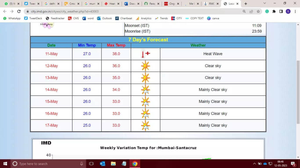 IMD च्या सांताक्रूझ वेधशाळेने 36.9 अंश नोंदवले, जे गेल्या 24 तासांत तीन अंशांनी वाढले होते. कुलाबा वेधशाळेत ३४.२ अंश तापमान नोंदवले गेले. IMD तज्ञांच्या म्हणण्यानुसार, 13 एप्रिल रोजी कमी होण्यापूर्वी ही स्थिती दोन दिवस कायम राहण्याची अपेक्षा आहे.