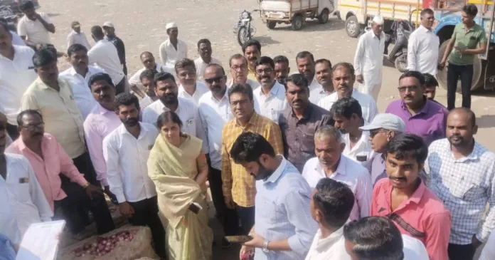 केंद्र सरकारने कांदा निर्यातीवर लादलेल्या बंदीमुळे कमी झालेल्या बाजार भावामुळे तसेच अवकाळी पावसाची भीती यामुळे मेटाकुटीला आलेल्या शेतकऱ्याला दर घसरण झाल्यामुळे प्रचंड आर्थिक फटका बसला आहे. त्यांना चिंतेने ग्रासले असल्याने शेतकऱ्याकडून मिळेल, त्या भावात कांदा विक्रीसाठी आणला जात आहे. मागील दीड दोन वर्षापासून श्रीगोंदा कृषी उत्पन्न बाजार समितीमध्ये बंद असलेला कांदा लिलाव बाजार समितीचे नूतन सभापती अतुल लोखंडे,उपसभापती मनीषा मगर तसेच संचालक मंडळाच्या प्रयत्नाने सुरु करण्यात आला.