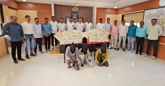 Thief : नगर : श्रीगोंदा तालुक्यातील पारगाव सुद्रीक येथे सुद्रीकेश्वर महाराज मंदिरातील (Sudrikeshwar Maharaj Temple) चांदीचे ३० किलो वजनाचे प्रभावळ चोरीस गेले होते. हा सर्व प्रकार सीसीटीव्ही कॅमेऱ्यात (CCTV camera) कैद झाला होता. स्थानिक गुन्हे शाखेने आज मंदिरातील तीन चोरांना (Thief) चांदीच्या प्रभावळीसह ताब्यात घेतले. भास्कर खेमा पथवे (रा. नांदुरी दुमाला, ता. संगमनेर), राजेंद्र ठकाजी उघडे (वय ३०, रा. नांदुरी दुमाला, ता. संगमनेर) व भाऊराव मुरलीधर उघडे (वय ३६, रा. विटा, ता. अकोले) अशी जेरबंद आरोपींची नावे आहेत.