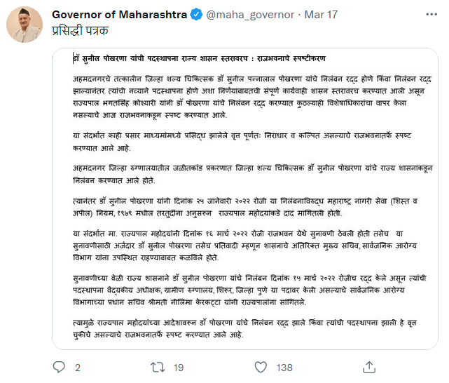 राज्यपालांच्या ट्विटरने हॅन्डलने गुरुवारी दुपारी सदर खुलासा करण्यात आलेला असून त्यात म्हटले आहे की, ‘ अहमदनगरचे तत्कालीन जिल्हा शल्य चिकित्सक डॉक्टर सुनील पन्नालाल पोखरणा यांचे निलंबन रद्द होणे किंवा निलंबन रद्द झाल्यानंतर त्यांची नव्याने पदस्थापना होणे या निर्णयाबाबतची संपूर्ण कार्यवाही शासनस्तरावर करण्यात आलेले आहे त्यामुळे काही प्रसार माध्यमांमध्ये प्रसिद्ध झालेले वृत्त हे पूर्णपणे निराधार आहे . ‘