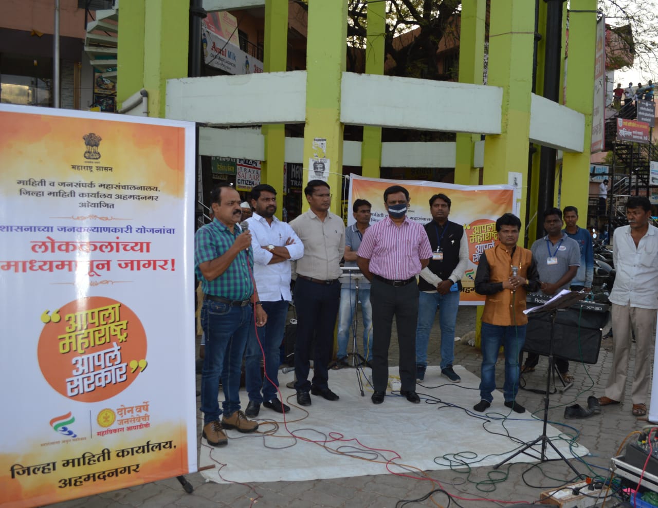 लोककला पथकांच्या माध्यमातून शासनाच्या लोककल्याणकारी योजनांचा प्रचार-प्रसार कार्यक्रमांची सुरूवात अहमदनगर जिल्ह्यात आजपासून झाली. शिर्डी येथे छत्रपती शिवाजी महाराज संकुल परिसरात आज कला साध्य कला पथकाचे शाहीर संदीप जाधव आणि त्यांच्या सहकाऱ्यांनी भारूडे, पोवाडा, शाहीरी या पारंपरिक माध्यमांतून कार्यक्रम सादर केला आणि शासकीय योजनांची माहिती नागरिकांना दिली. कार्यक्रमाचे उद्घाटन प्रांताधिकारी गोविंद शिंदे यांच्याहस्ते, नगर पंचायतीचे मुख्याधिकारी काकासाहेब डोईफोडे आणि नगर सेवक सचिन चौगुले यांच्या प्रमुख उपस्थितीतीत झाले.
