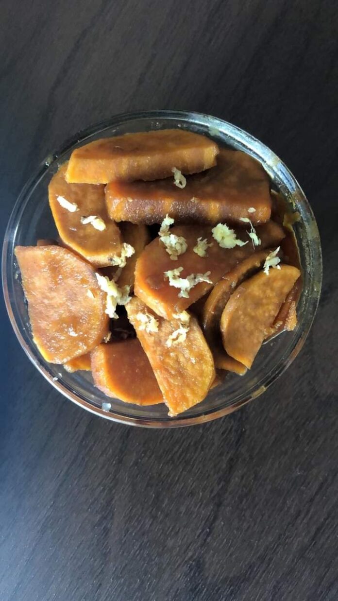 ३) काचऱ्या शिजल्या की किसलेला गूळ घालून हलक्या हाताने मिक्स करावे.दोन छोटे चमचे पाणी घाला, गूळ वितळला की थोडावेळ परतावे म्हणजे रताळी छान खरपूस होतील.